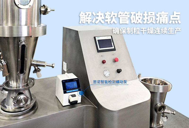 針對這一痛點,該企業為其制粒干燥機配套選用了iPump2ZS-B+FT15智能檢測蠕動泵。這款設備配備的漏液報警系統解決了難題。