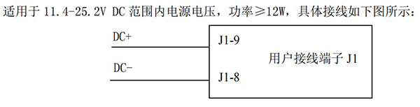 直流電源供電連接方法:適用于,11.4-25.2V DC 范圍內電源電壓,功率≥12W,具體接線如下圖所示: