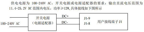 交流電源供電連接方法:供電電源為 100-240V AC,開關電源或電源適配器的要求:輸出直流電壓范圍為11.4-25.2V DC 范圍內電壓,功率≥12W,具體接線如下圖所示: